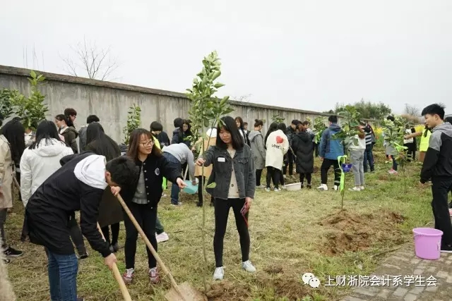 活动实行“一班一树”制,即每班种树一棵。首先,会计系学生会青年志愿者部组织各班班主任带领学生种植苗。植树现场,同学们有的拿起铁锹,锄头开始埋头挖坑,有的则挥锹铲土、扶树填土、培土浇水,大家互相配合,忙得不亦乐乎。经过一个多小时的劳作,45棵柚子新苗在绿化带“安家落户”。
